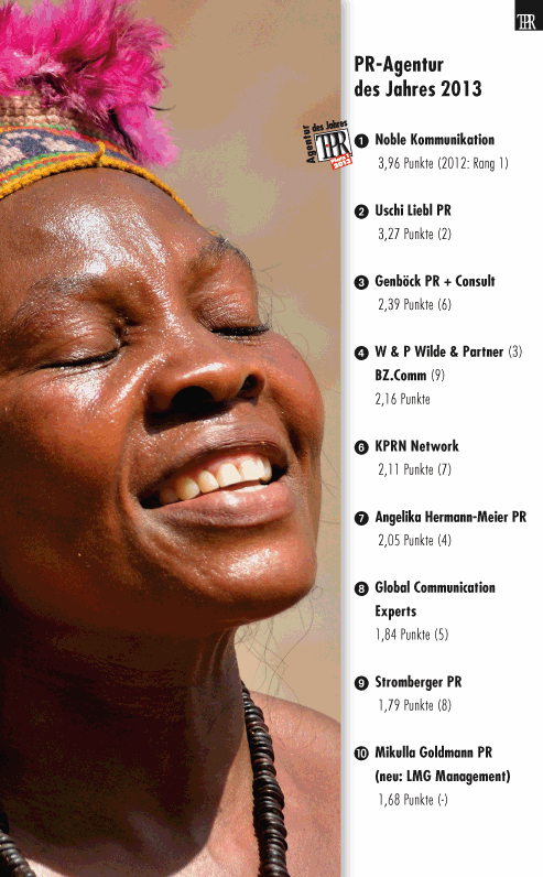 Ergebnisse der Wahl der PR-Agentur des Jahres 2013Die Top Ten, die Einzelwertungen zu Mailings, Anfragen, Organisation, Kreativität und die Jury-Mitglieder![]() Hier geht es zu den Einzelergebnissen:Einzelergebnisse zur Wahl der Agentur des Jahres 2013, Seite 1 Einzelergebnisse zur Wahl der Agentur des Jahres 2013, Seite 2