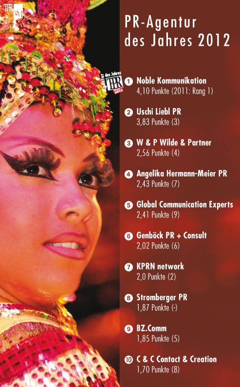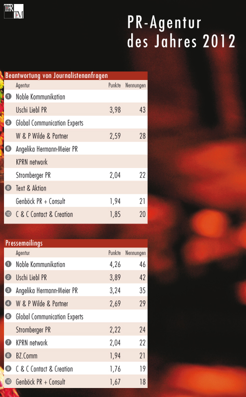 Ergebnisse der Wahl der PR-Agentur des Jahres 2012Die Top Ten, die Einzelwertungen zu Mailings, Anfragen, Organisation, Kreativität und die Jury-Mitglieder.... ![]() ![]() ![]() ![]() ![]() So haben wir gewertet:Jeder der Juroren konnte bis zu zehn Agenturen jeweils maximal fünf geben: einen für die Nennung als solche sowie je einen Sonderpunkt für besondere Stärken bei